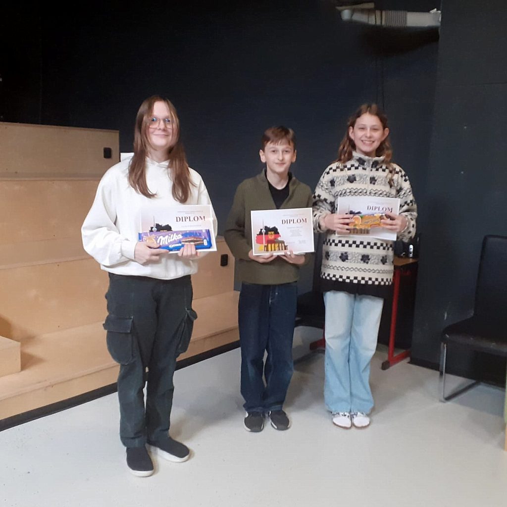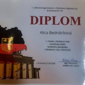 Naša škola pokračuje aj tento rok v tradícii školskej recitačnej súťaže v nemeckom jazyku Goetheho pamätník. Žiaci ISCED 2 absolvovali triedne kolá a najlepší z nich reprezentovali svoje triedy 27. marca 2026 v školskom kole. Žiaci, ktorí sa učia nemčinu prvý rok, predniesli krátku detskú báseň. Pokročilejší žiaci už zvládli náročnejšie básne. Všetci súťažiaci podali veľmi pekné výkony.