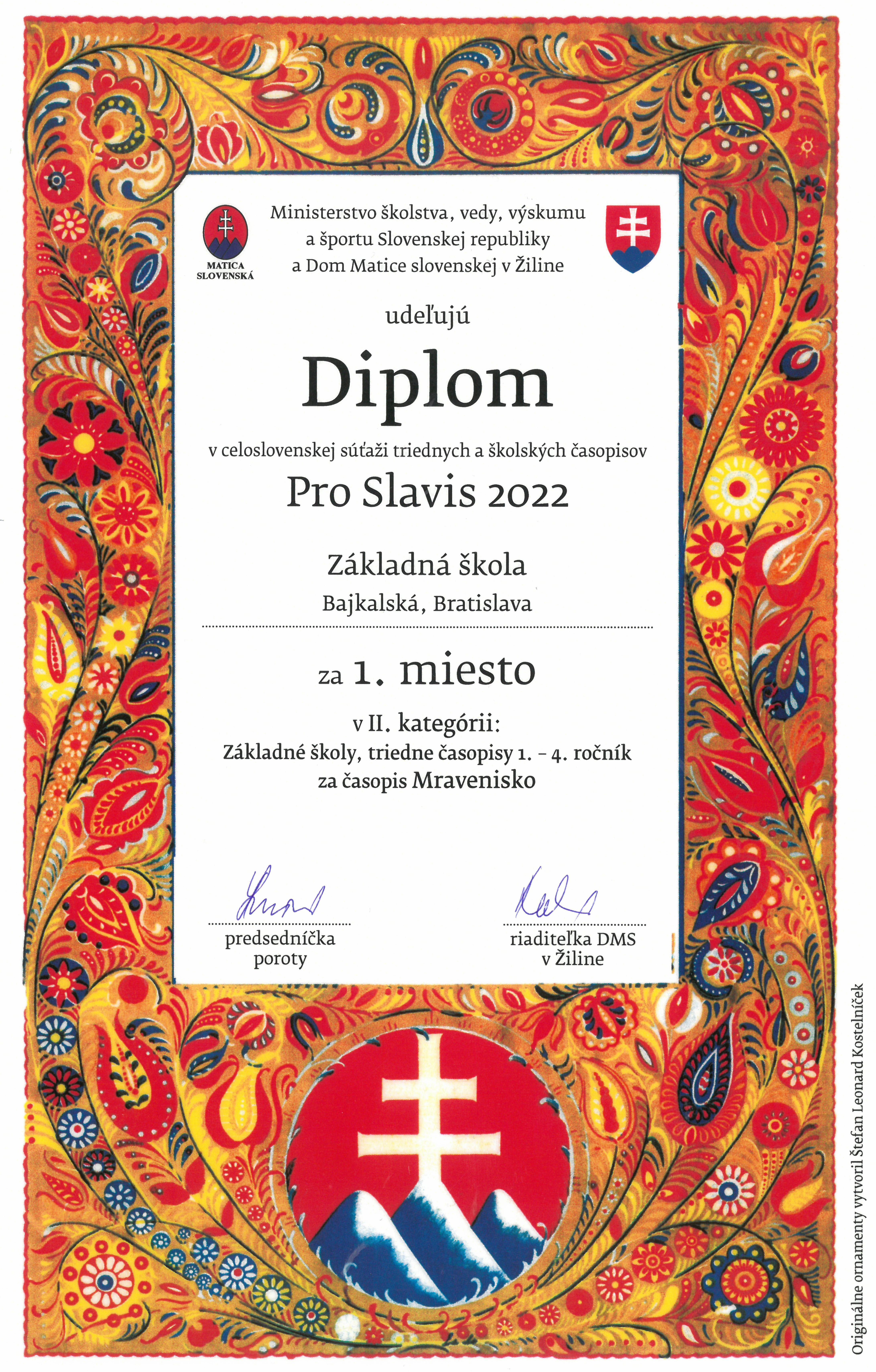 | Dom Matice slovenskej v Žiline a Ministerstvo školstva SR udelilo 1. miesto v celoslovenskej súťaži školských časopisov Pro Slavis 2021/2022 časopisu Mravenisko v kategórii I. – základné školy, triedne časopisy 1. – 4. ročník. Rovnako, v roku 2025 udelil Dom Matice slovenskej v Žiline a Ministerstvo školstva SR 1. miesto v celoslovenskej súťaži školských časopisov Pro Slavis 2023/2024 časopisu Mravenisko v kategórii I. – základné školy, triedne časopisy 1. – 4. ročník. |