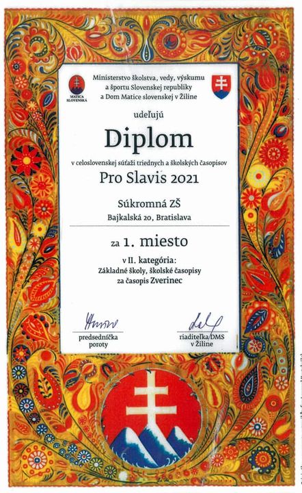 | Dom Matice slovenskej v Žiline a Ministerstvo školstva SR udelilo 1. miesto v celoslovenskej súťaži školských časopisov Pro Slavis 2021/2022 časopisu Zverinec v kategórii II. – základné školy. |