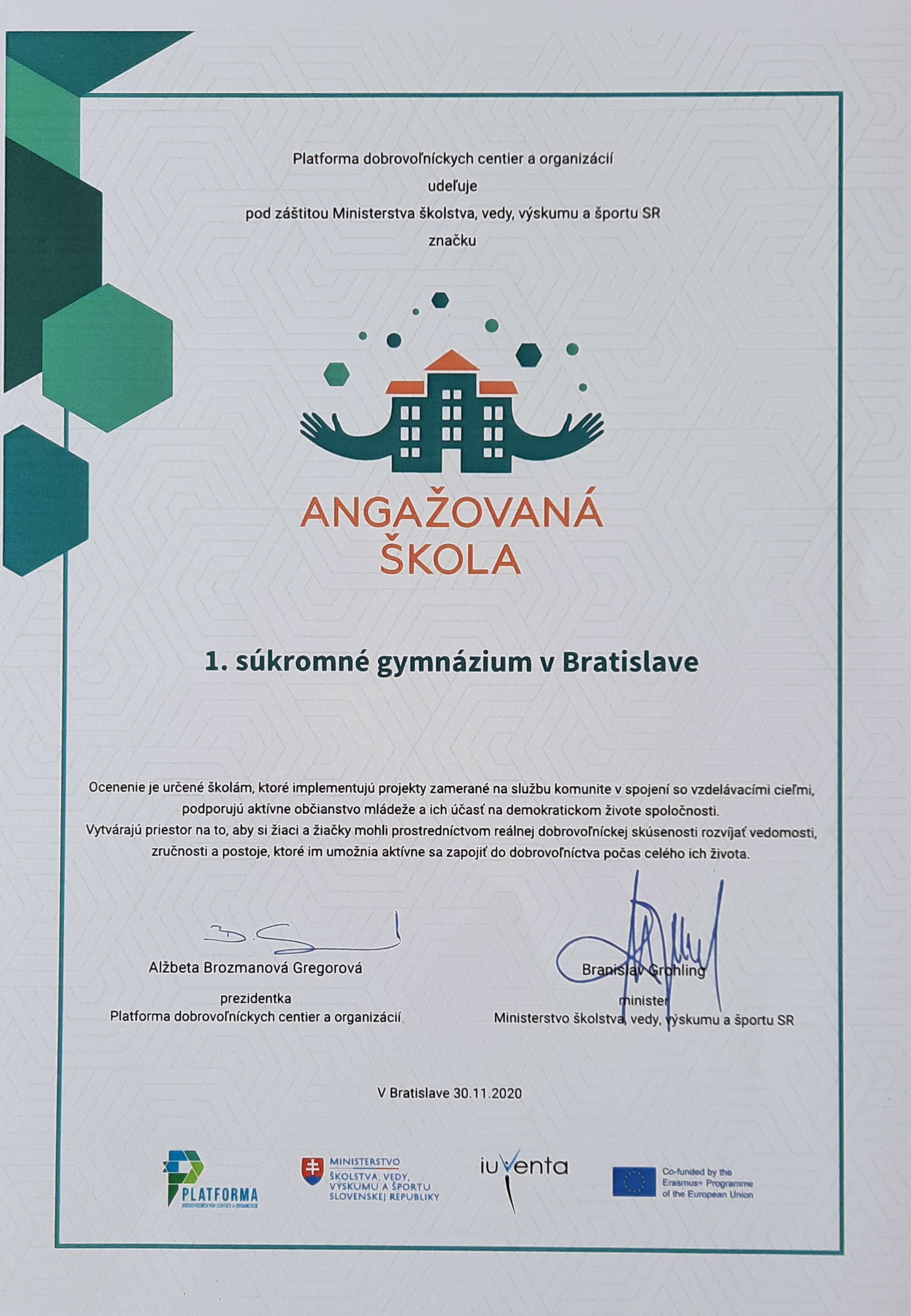 Angažovaná škola – Ocenenie Platformy dobrovoľníckych centier a organizácií školám, ktoré realizujú service learningové projekty, podporujú aktívne občianstvo mládeže a realizujú aktivity v prospech komunity, ktorými dosahujú vzdelávacie ciele. |