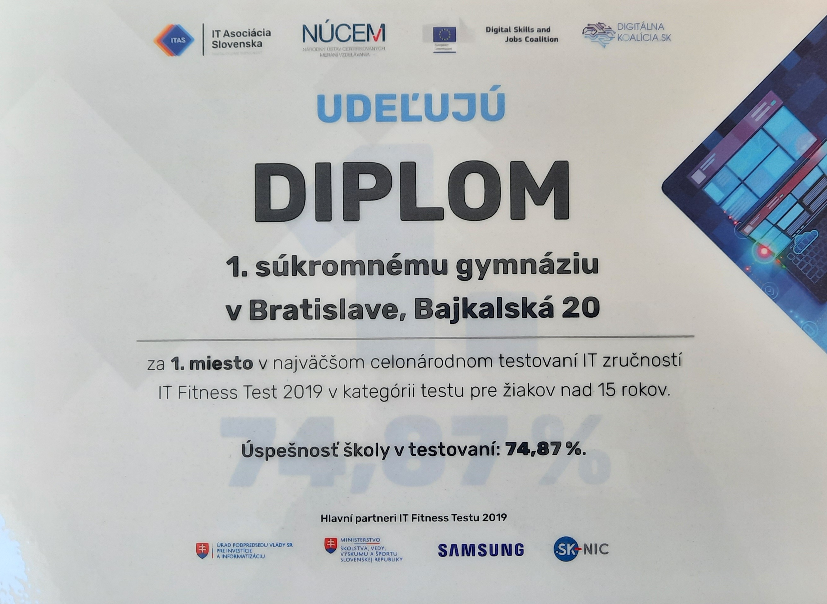 | Za 1. miesto v najväčšom celonárodnom testovaní IT zručností IT Fitness Test v r. 2019 a v r. 2025 v kategórii testu pre žiakov nad 15 rokov. |