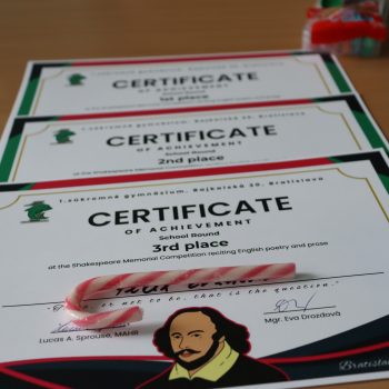 V poradí 28. ročník školského kola recitačnej súťaže, ktorý sa nesie pod názvom Shakesparearov pamätník, sa uskutočnil dňa 26. 11. 2024 a opäť bol mimoriadne úspešný. Porota v zložení Eva Drozdová a Lucas Sprouse si vypočula prednesy mnohých žiakov malého gymnázia a vybrali troch najlepších v jednotlivých kategóriách. Víťazi, teda súťažiaci, ktorí skončili na prvých miestach, postupujú do národného kola a budú mať možnosť recitovať v SND dňa 2. 11. 2024.
