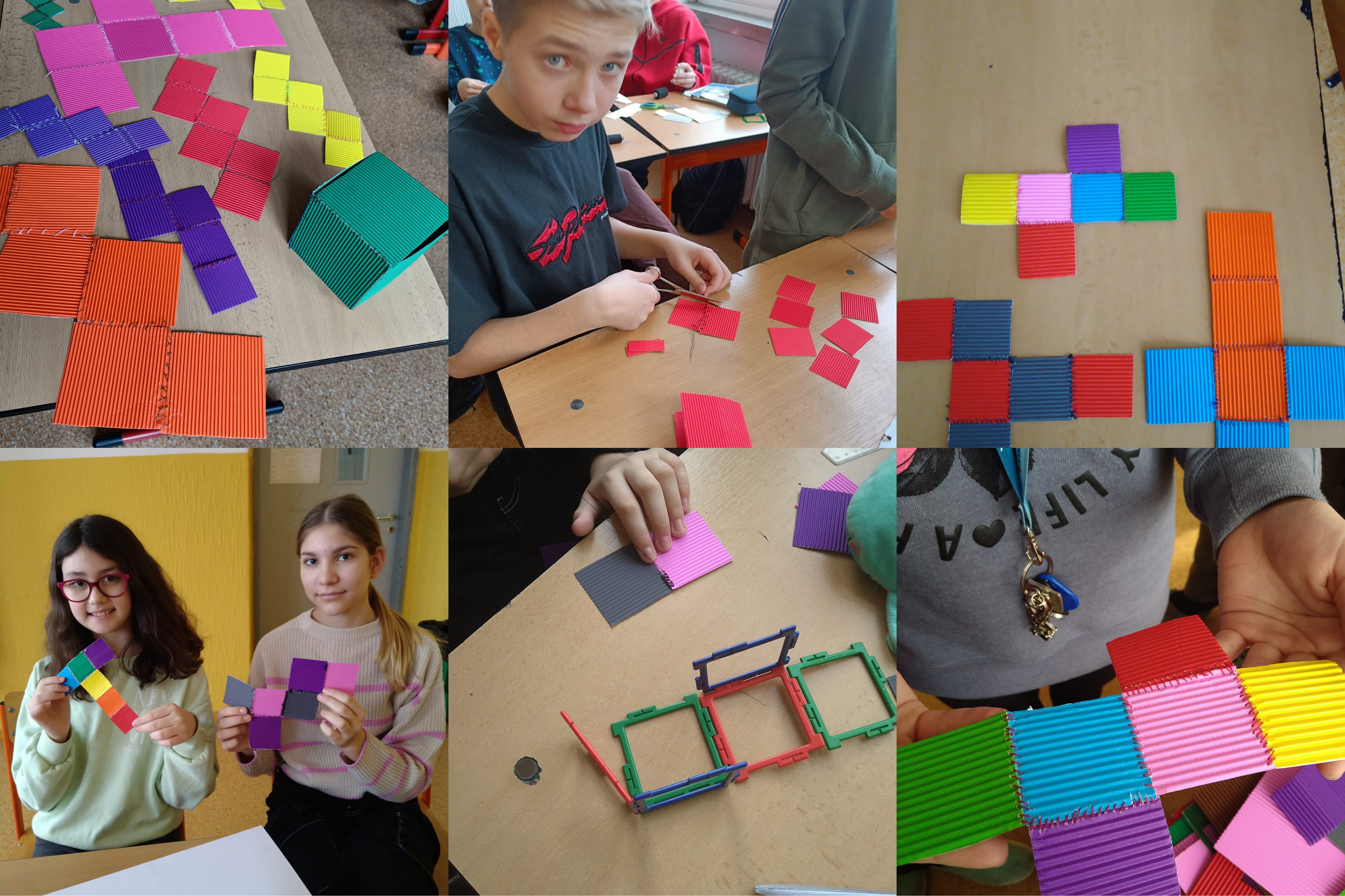 Ako sme obliekali kocku: Žiaci 6. ročníka a sekundy vzali do rúk ihly a nite a pustili sa do šitia siete kocky. Mnohí si po prvýkrát vyskúšali robiť uzlíky a prevliekať niť, čím si rozvíjali jemnú motoriku. Preverili viacero možností ako usporiadať 6 štvorcov tak, aby dokázali kocku obliecť.