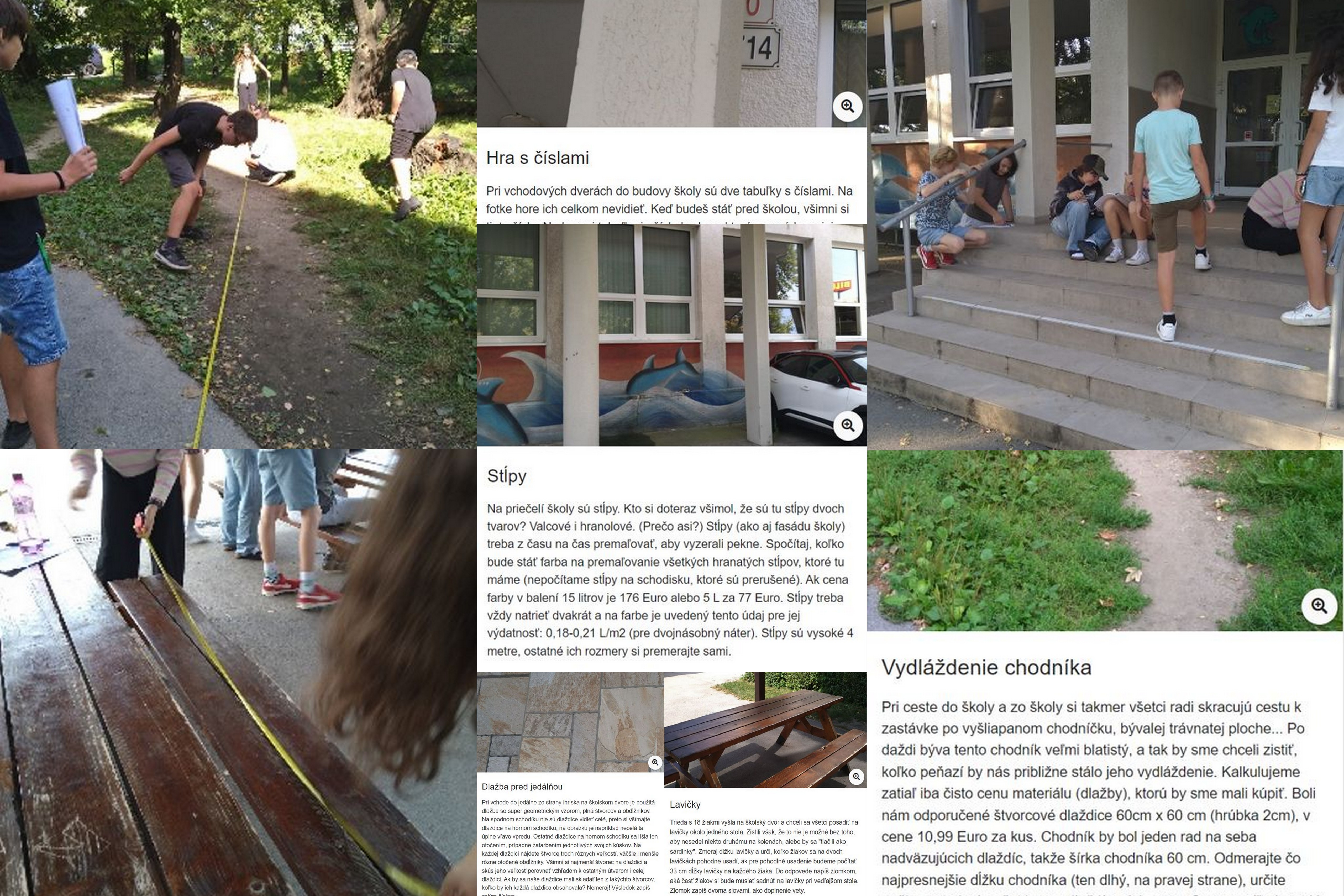 Na obrázkoch si môžete pozrieť zadania nami pripravenej sady úloh pre historicky prvú matematickú prechádzku na Bajkalskej. Ďalšie fotografie ukazujú zaujatú prácu pri riešení úloh žiakov 6. a 7. ročníka ZŠ. Deti ocenili nový typ aktivity, pri ktorej mohli počítať matematické zadania na čerstvom vzduchu. Uvedomili si, že matematika sa dá ozaj nájsť takmer na každom kroku. Fotogaléria MathCityMap