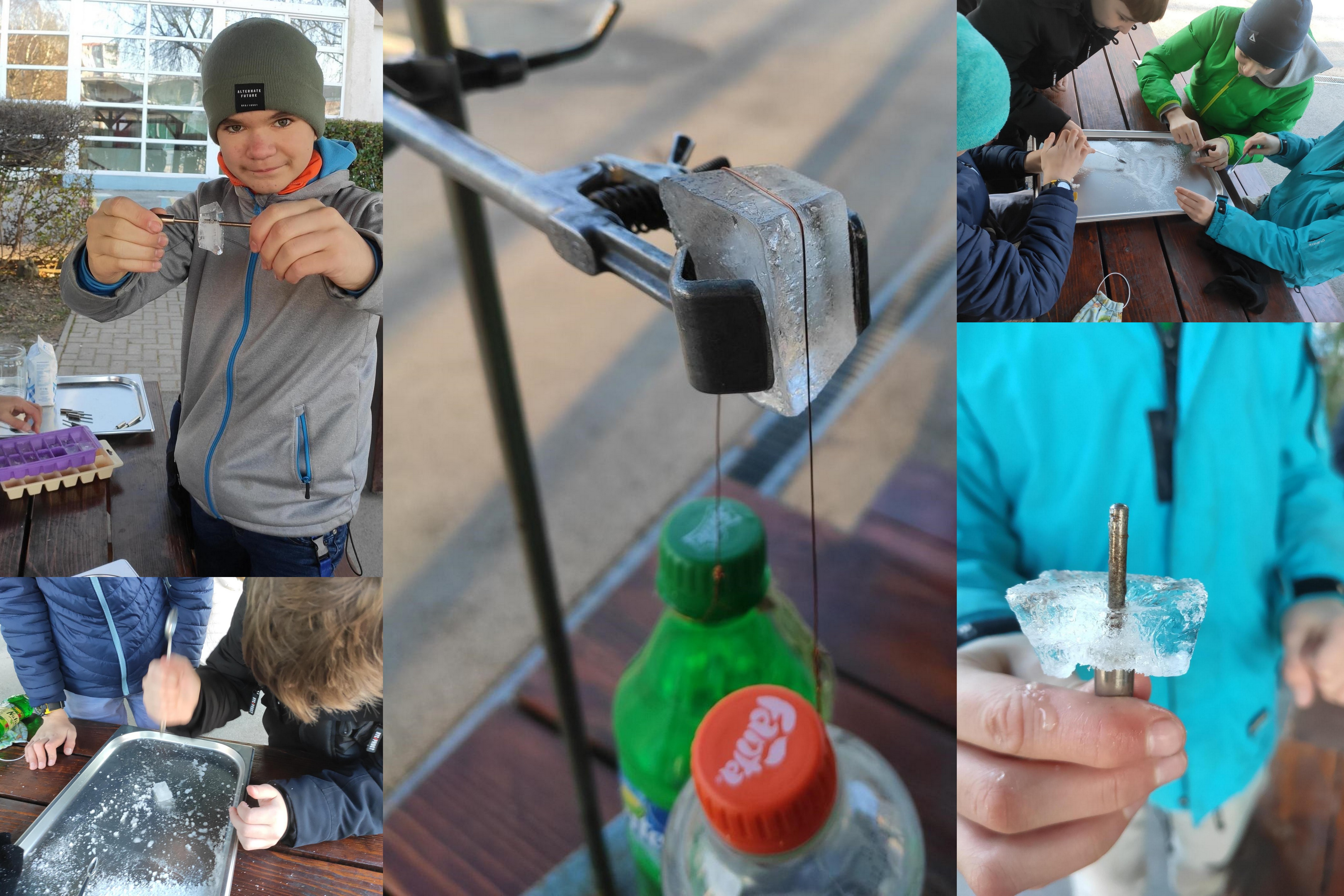 Topenie ľadu: Hodina prírodovedy na tému ľad pozostávala z dvoch praktických pokusov a ich vyhodnotení: urob dieru do ľadu (pôsobením soli a tlaku sa to podadí) a prerež ľad drôtom (drôt sa síce prereže, no kocka zostane celá). Je skvelé, že sa to naši žiaci naučili prakticky, na školskom dvore, formou zážitku.