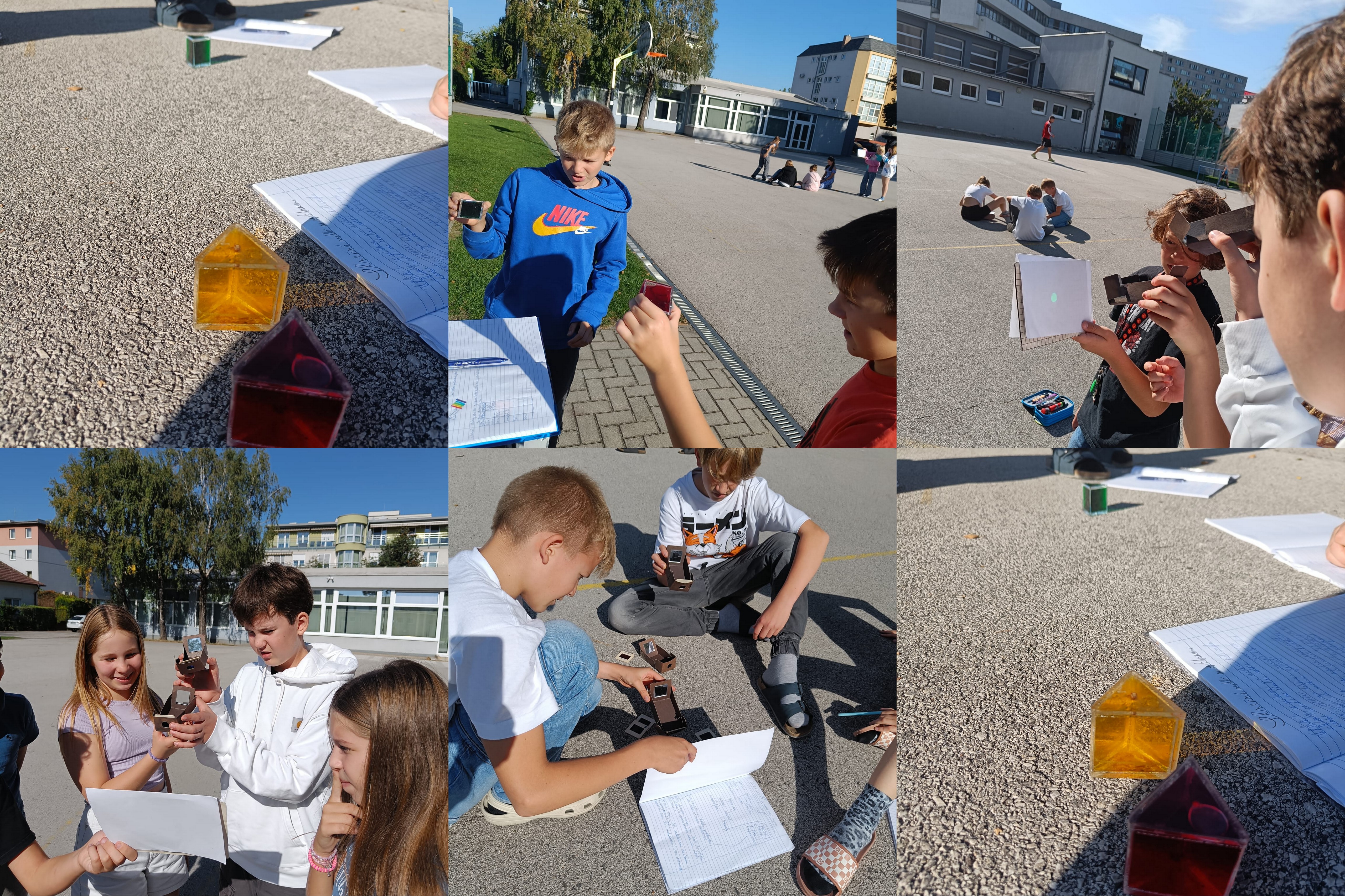 Skúmanie vlastností svetla: Slnečné septembrové dni využili naši žiaci aj na skúmanie vlastností svetla – odhalili tajomstvá farebných filtrov, rozložili svetlo na farebné spektrum, skúmali odraz farebných lúčov na farebných povrchoch, či ich prechod cez farebné kvapaliny. Aj na základe týchto pokusov už naši šiestaci vedia lepšie odpovedať na otázky: „Prečo vidíme? Prečo ak pozeráme cez farebný filter, tak okolie vidíme v iných farbách? „Prečo majú rôzne predmety rôznu farbu?“.