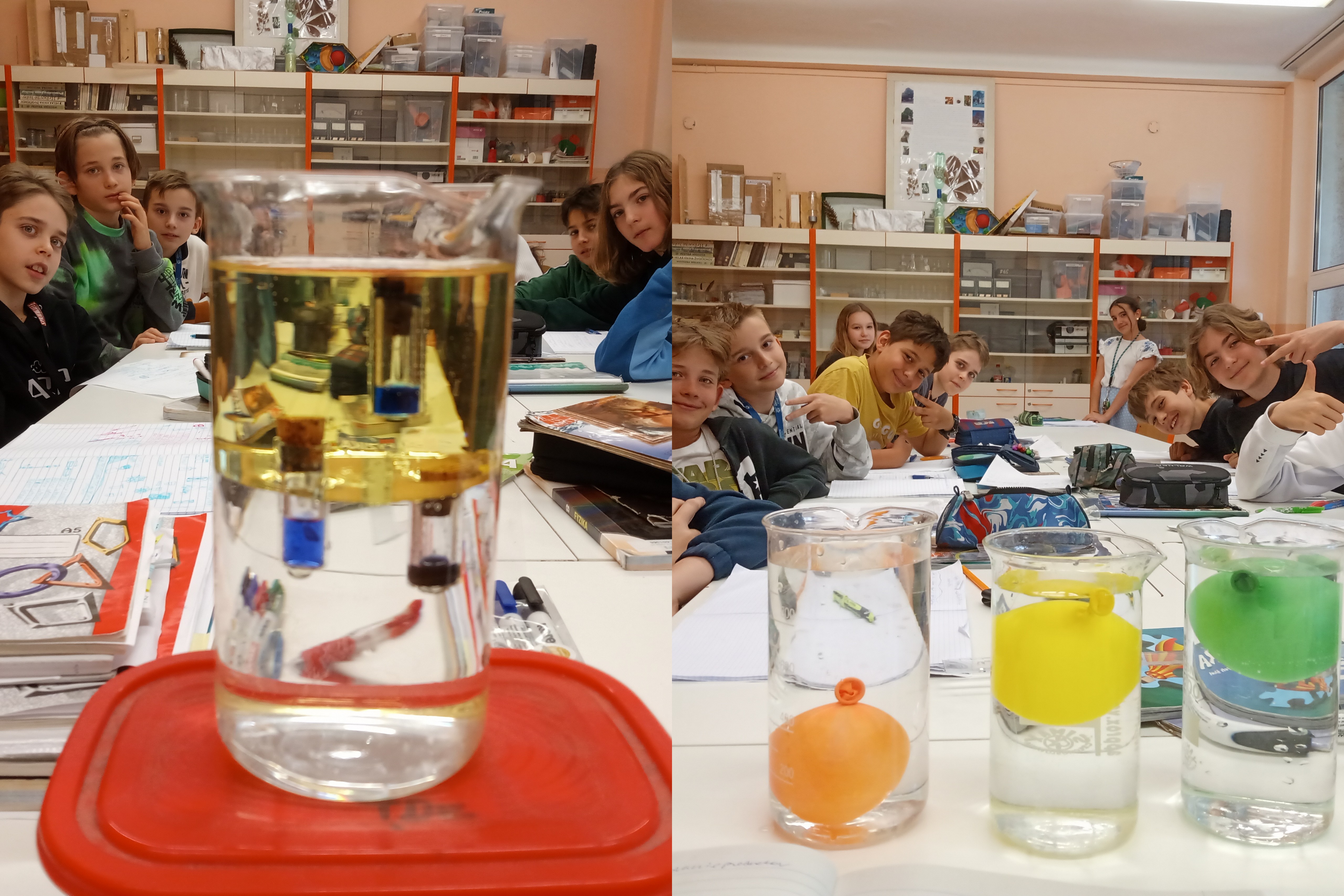 Vlastnosti kvapalín: Na hodinách prírodovedy žiaci prímy a šiesteho ročníka skúmali vlastnosti kvapalín a porovnávali ich vzájomné pôsobenie. Taktiež pozorovali správanie sa predmetov v rozličných kvapalinách.